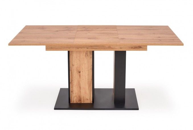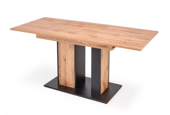 Разтегателна трапезна маса DOLOMIT – дъб вотан и черно с механизъм за разтягане, устойчиво ПДЧ и стилен дизайн за модерна трапезария