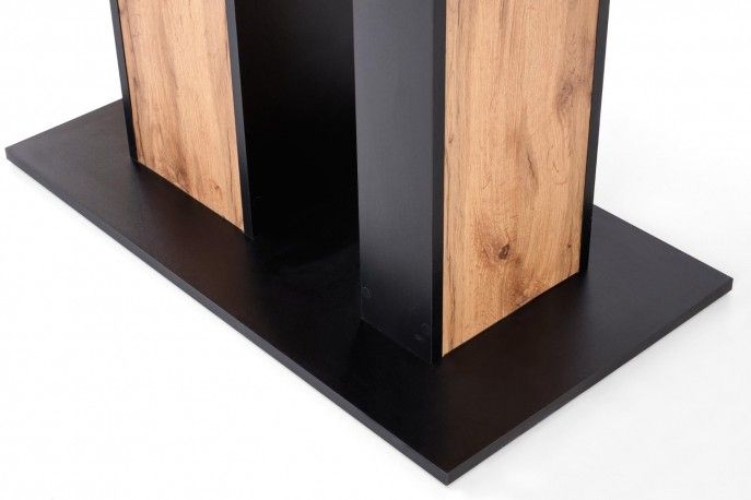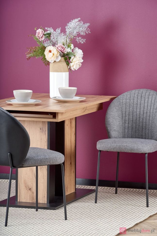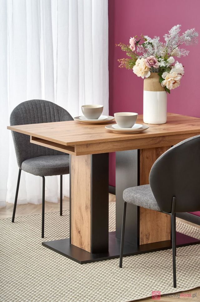 Разтегателна трапезна маса DOLOMIT съчетава топлия и естествен вид на дъб вотан с елегантни черни елементи, които придават модерен и стилен акцент на трапезарията, кухнята или дневната. Този модел разполага с функционален механизъм за разтягане, който позволява лесно да увеличите дължината на масата за повече пространство при семейни вечери или гости.